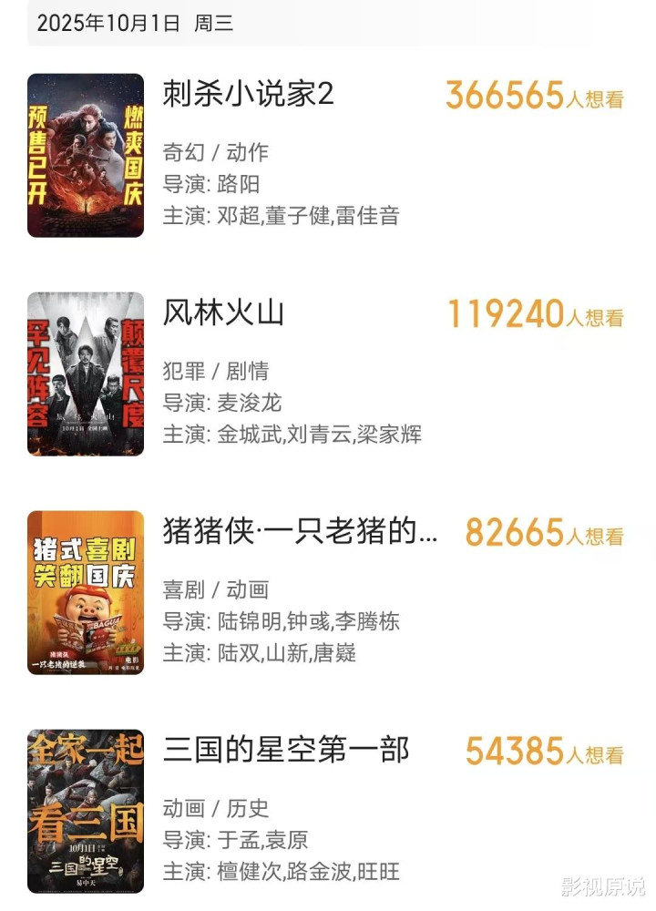 想看人数最多,预售票房最高,《刺杀小说家2》如果口碑不崩的话,那么今年国庆档的冠军大概率就会是它。